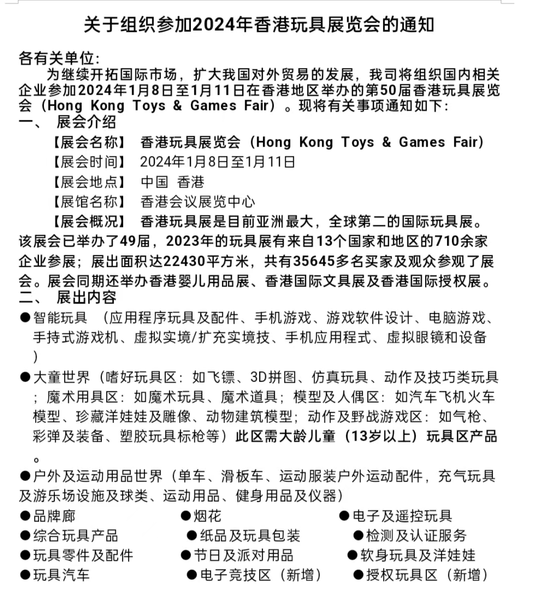 关于组织参加2024年香港玩具展览会的通知 各有关单位: 为继续开拓国际市场,扩大我国对外贸易的发展,我司将组织国内相关企业参加2024年1月8日至1月11日在香港地区举办的第50届香港玩具展览会(Hong Kong Toys & Games Fair)。现将有关事项通知如下: 一、 展会介绍 【展会名称】 香港玩具展览会(Hong Kong Toys & Games Fair) 【展会时间】 2024年1月8日至1月11日 【展会地点】 中国 香港 【展馆名称】 香港会议展览中心 【展会概况】 香港玩具展是目前亚洲最大,全球第二的国际玩具展。该展会已举办了49届,2023年的玩具展有来自13个国家和地区的710余家企业参展;展出面积达22430平方米,共有35645多名买家及观众参观了展会。展会同期还举办香港婴儿用品展、香港国际文具展及香港国际授权展。 二、 展出内容 ●智能玩具 (应用程序玩具及配件、手机游戏、游戏软件设计、电脑游戏、手持式游戏机、虚拟实境/扩充实境技、手机应用程式、虚拟眼镜和设备) ●大童世界(嗜好玩具区:如飞镖、3D拼图、仿真玩具、动作及技巧类玩具;魔术用具区:如魔术玩具、魔术道具;模型及人偶区:如汽车飞机火车模型、珍藏洋娃娃及雕像、动物建筑模型;动作及野战游戏区:如气枪、彩弹及装备、塑胶玩具标枪等)此区需大龄儿童(13岁以上)玩具区产品。 ●户外及运动用品世界(单车、滑板车、运动服装户外运动配件,充气玩具及游乐场设施及球类、运动用品、健身用品及仪器) ●品牌廊 ●烟花 ●电子及遥控玩具 ●综合玩具产品 ●纸品及玩具包装 ●检测及认证服务 ●玩具零件及配件 ●节日及派对用品 ●软身玩具及洋娃娃 ●玩具汽车 ●电子竞技区(新增) ●授权玩具区(新增)