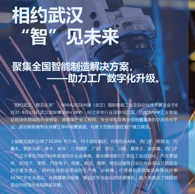 展会介绍 IA wuhan2023 武汉国际工业装配及传输技术展览会、武汉国际工厂及过程自动化展览会由湖北省机械行业联合会、湖北省激光行业协会、武汉亚太瑞斯会展服务有限公司联合主办,将于2023年8月31-9月3日在武汉国际博览中心举办,为期4天展出时间,更多产品和智能自动化生产技术展览以及更多的参会者!上届展会,IA wuhan吸引了来自 23 个国家和地区近 47,800 名参会者,共同体验了大会主题 — “工业创新,智造未来”,了解工装配对我们国家智能制造的影响,探索与未来工厂的产品和技术。